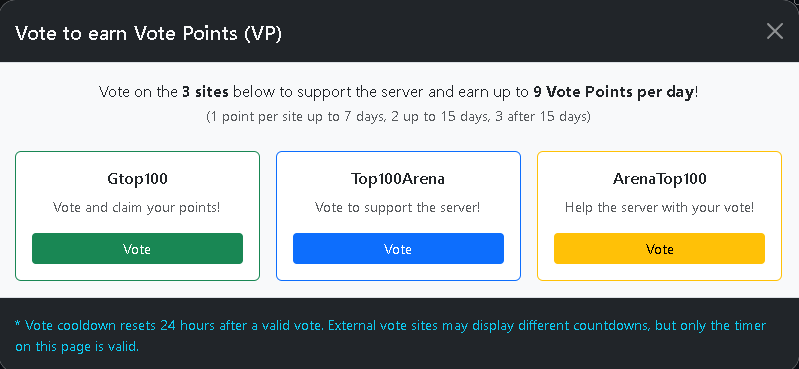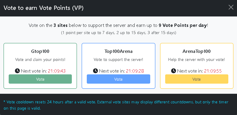 Changed: Instead of resetting 24 hours after a valid vote, the cooldown to vote again now resets at 00:00 UTC. Even if a voting site shows a different countdown, always follow the timer displayed on our website.