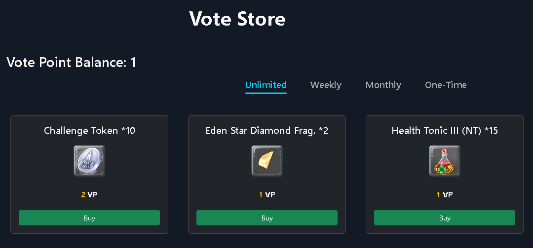 Note: This is a new feature currently in the testing phase, so changes, adjustments, and occasional issues may occur. The same applies to the Vote Store — new items may be added over time as we continue improving the system.